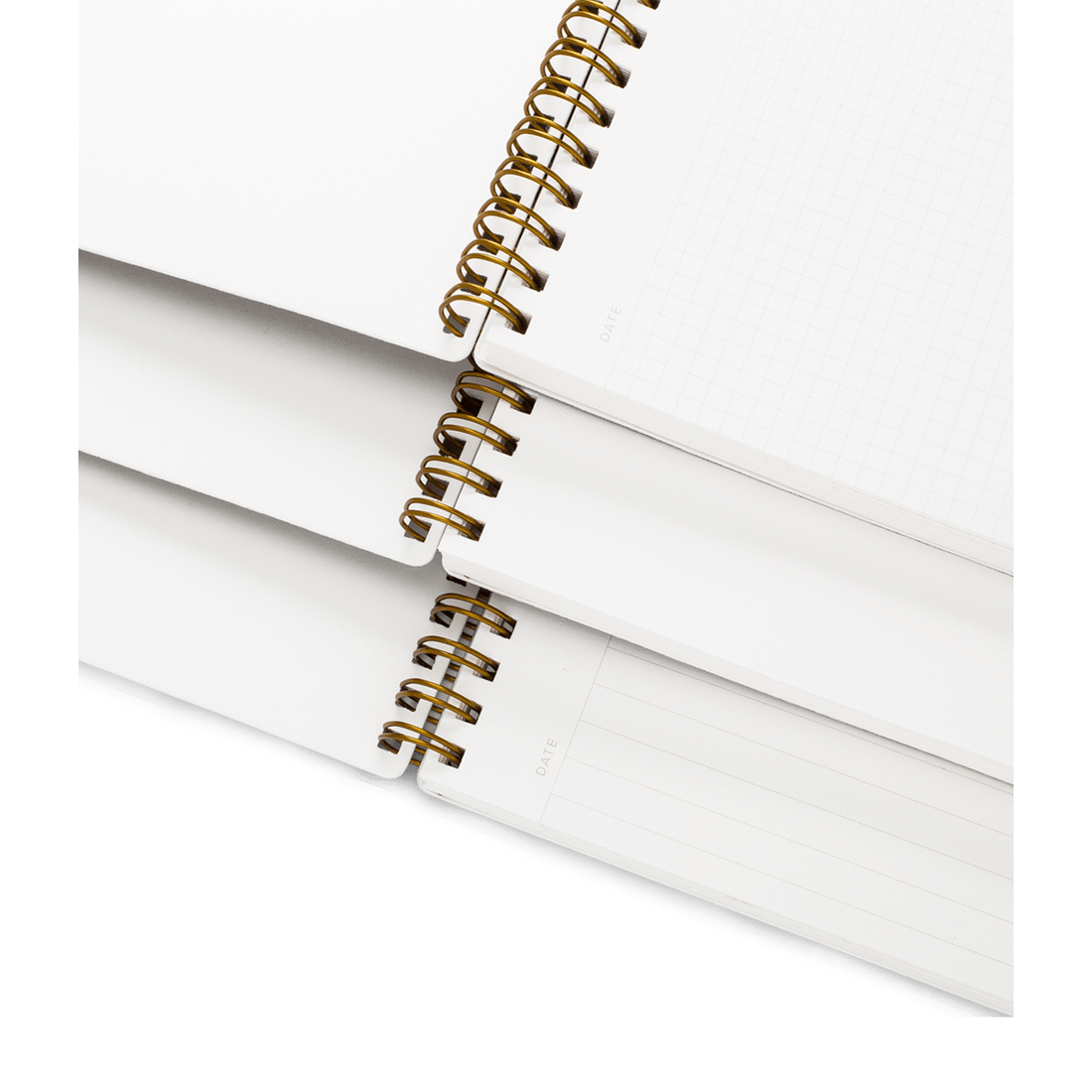 Features: Bookcloth Cover, brass coil, 70# Smooth Text, Made with recycled paper & renewable energy, grid ruling is one-sided