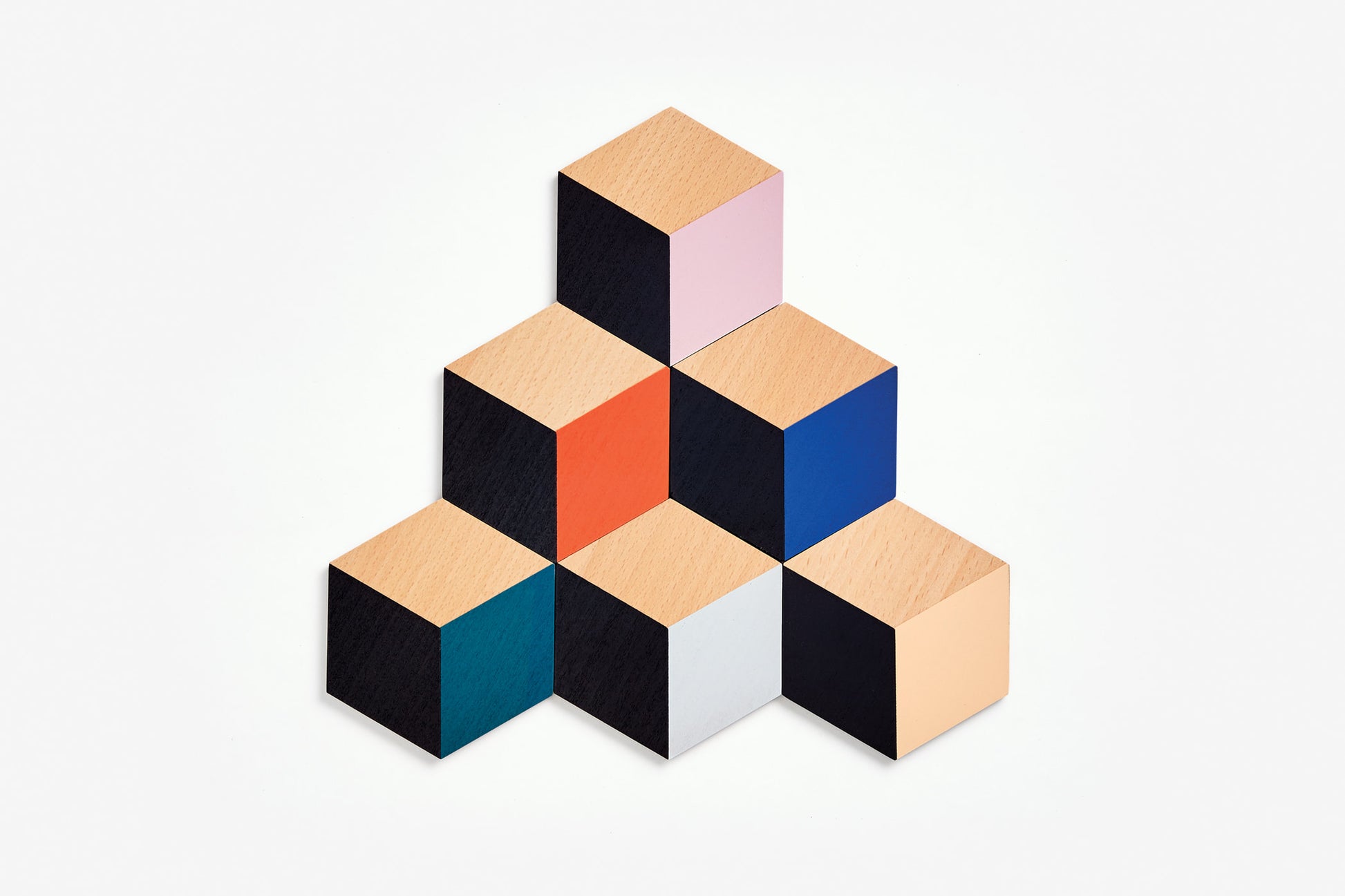 This set of six coasters can be arranged to form a tiled trivet. The illusion of 3D through color and geometry allows for endless permutations, encouraging playful mosaic building on your table.