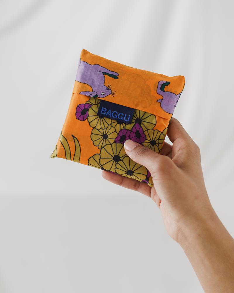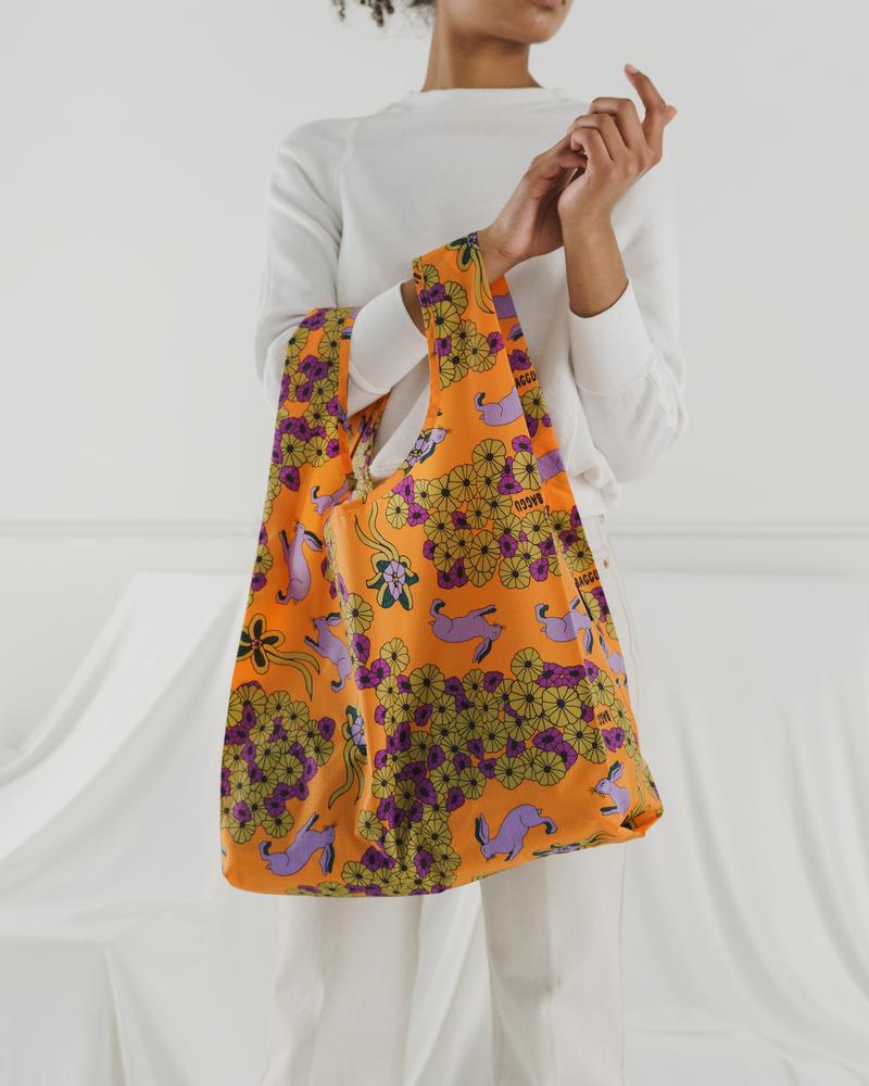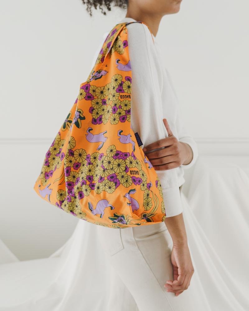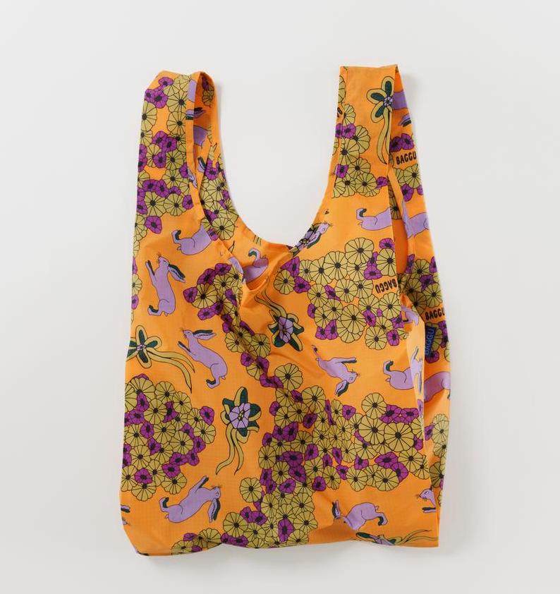 Baggu's best selling reusable bag is not just for the grocery store, it goes everywhere and hauls (practically) anything. Carry in your hand or over your shoulder. Holds 2 –3 plastic grocery bags worth of stuff. Folds into a flat 5"x5" pouch. Holds 50 lbs. Now made from 40% recycled nylon sourced from pre-consumer waste.<br / />DIM'<br />25 "x15 "x6"<br />MAT 'L<br />100% ripstop nylon (40% recycled)<br />CARE<br />Machine wash cold, line dry