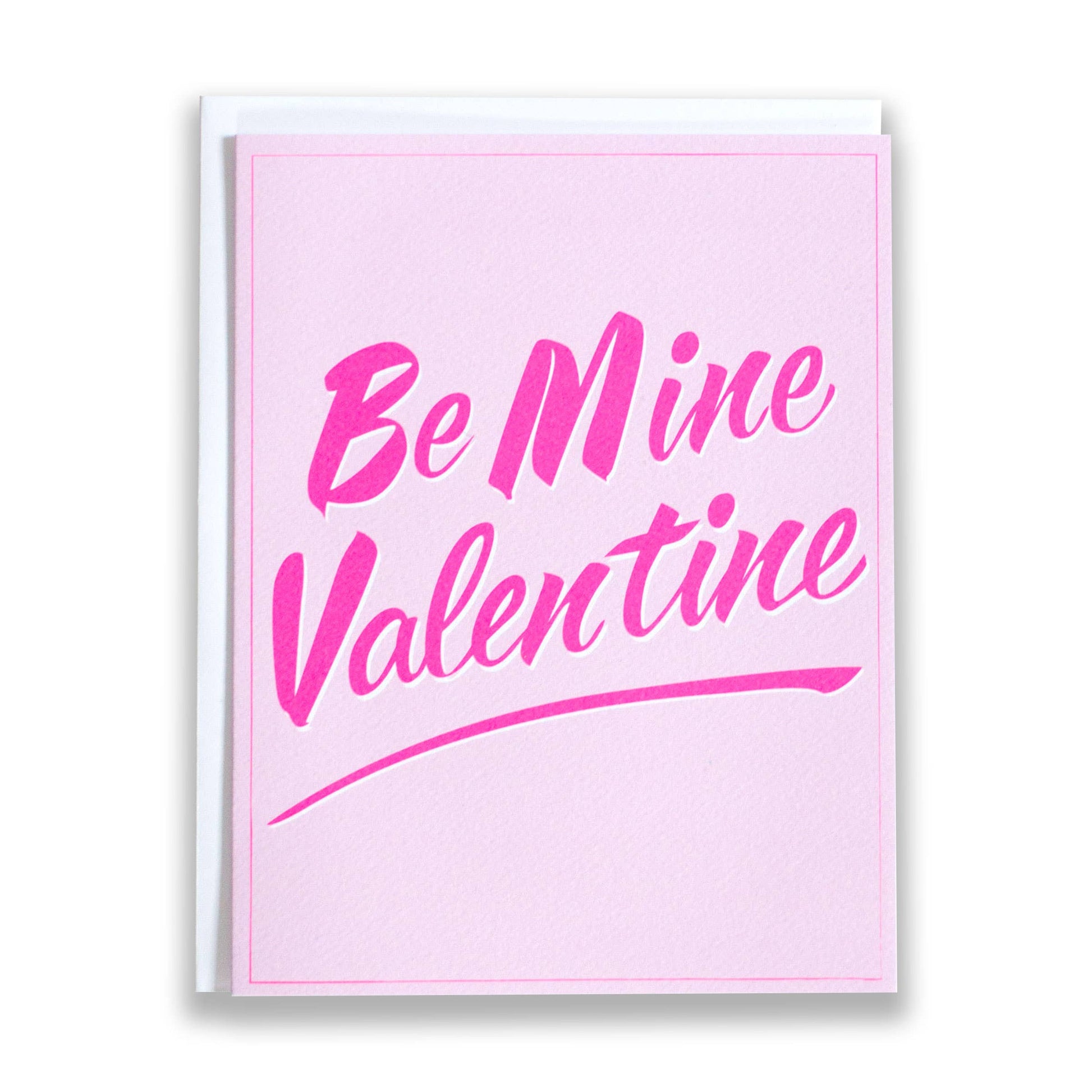 Neon pink and blush "Be Mine Valentine" in an old school 80s movie poster typeface, makes this note card the one for your special sweetheart.