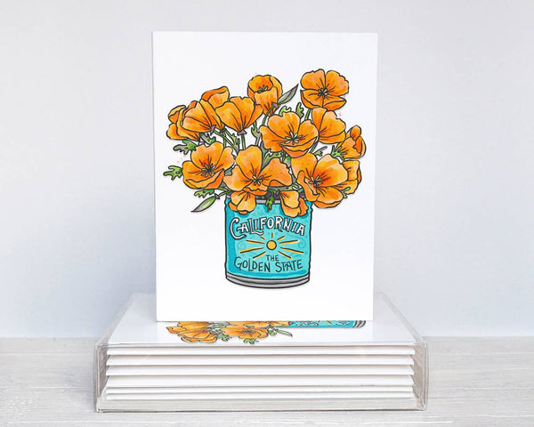 Celebrate the Golden State, featuring an arrangement of cheery California poppies in a vintage-inspired can. Painted in a watercolor style, show your love for the California state flower with these vibrant cards. • A2 size • Printed in California • 130 lb ultra white card stock • Blank inside • Comes with coordinating white envelopes •