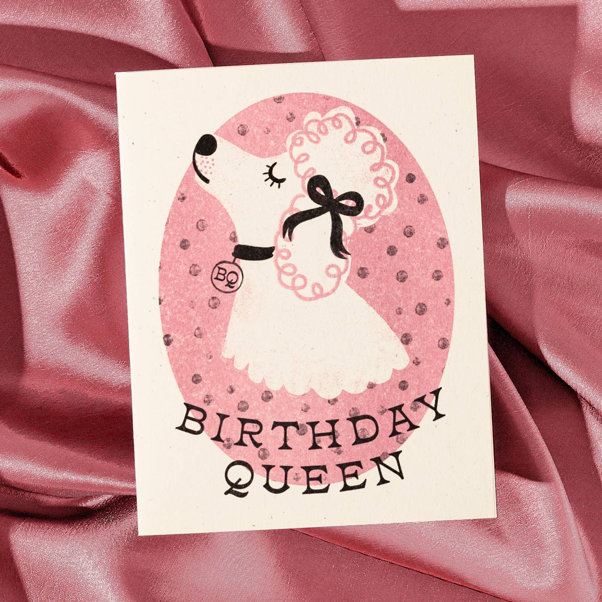 A prissy poodle is gussied up for her birthday! She's a queen! Risograph printed in light mauve and black.