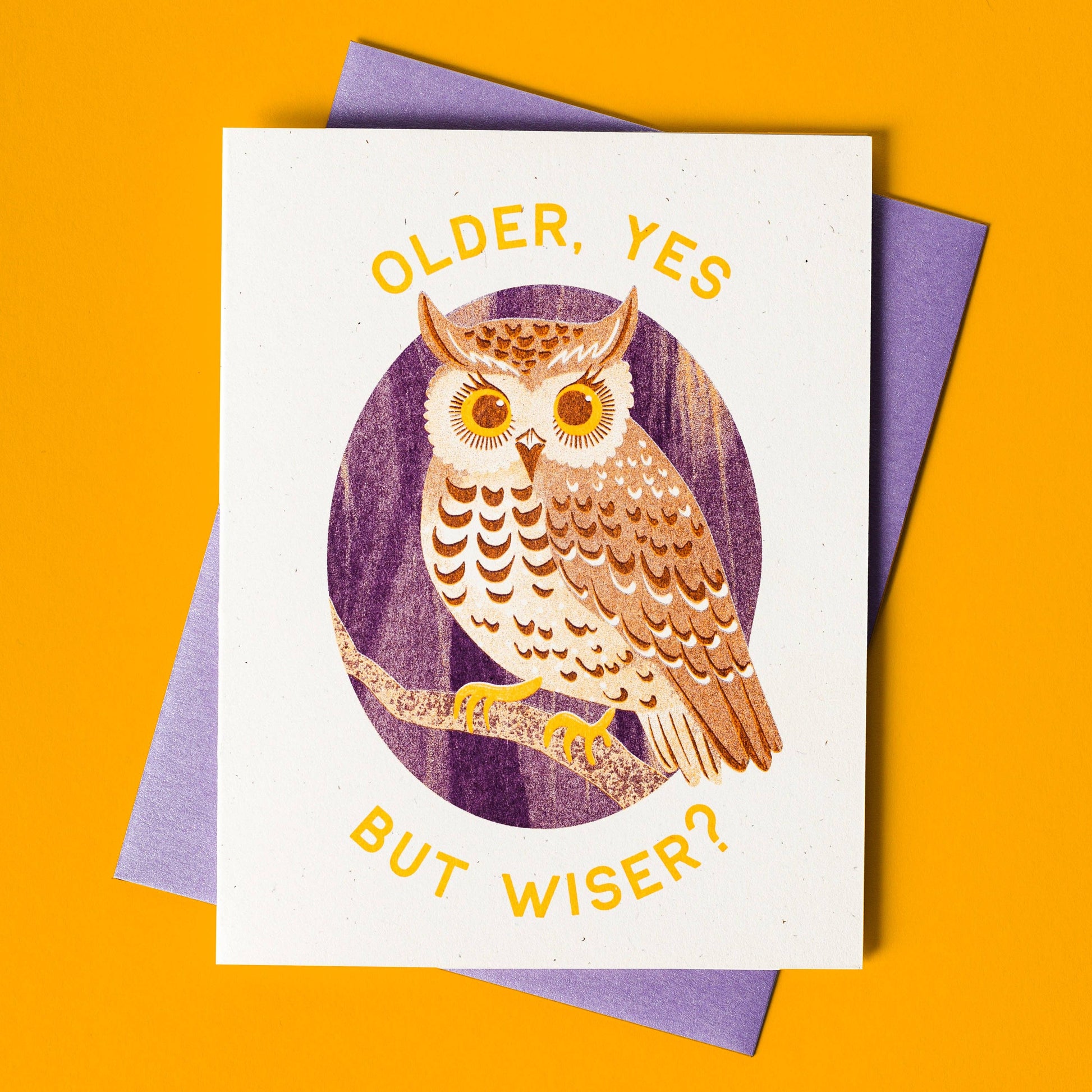 We all get older, yes. But do we truly get wiser? Maybe not! Either way, this cute owl is here to deliver a birthday message. “Risograph printed in plum and sunflower yellow.