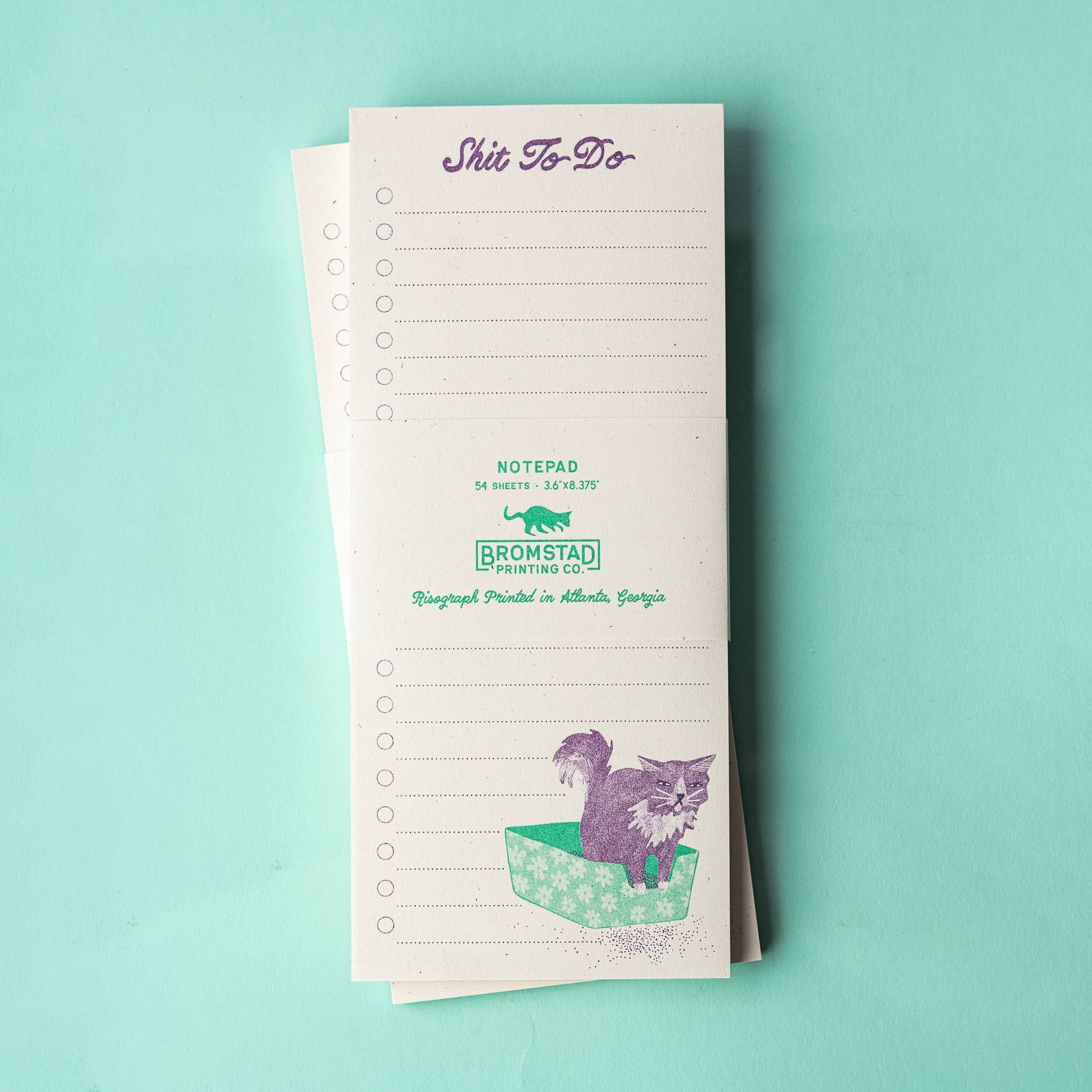 Notepads! A grumpy cat does their business in a floral litter box. This charming to-do list notepad features 21 lines to detail all your business with 52 tear-off sheets on a chipboard backer. Risograph printed in seafoam green and plum purple.