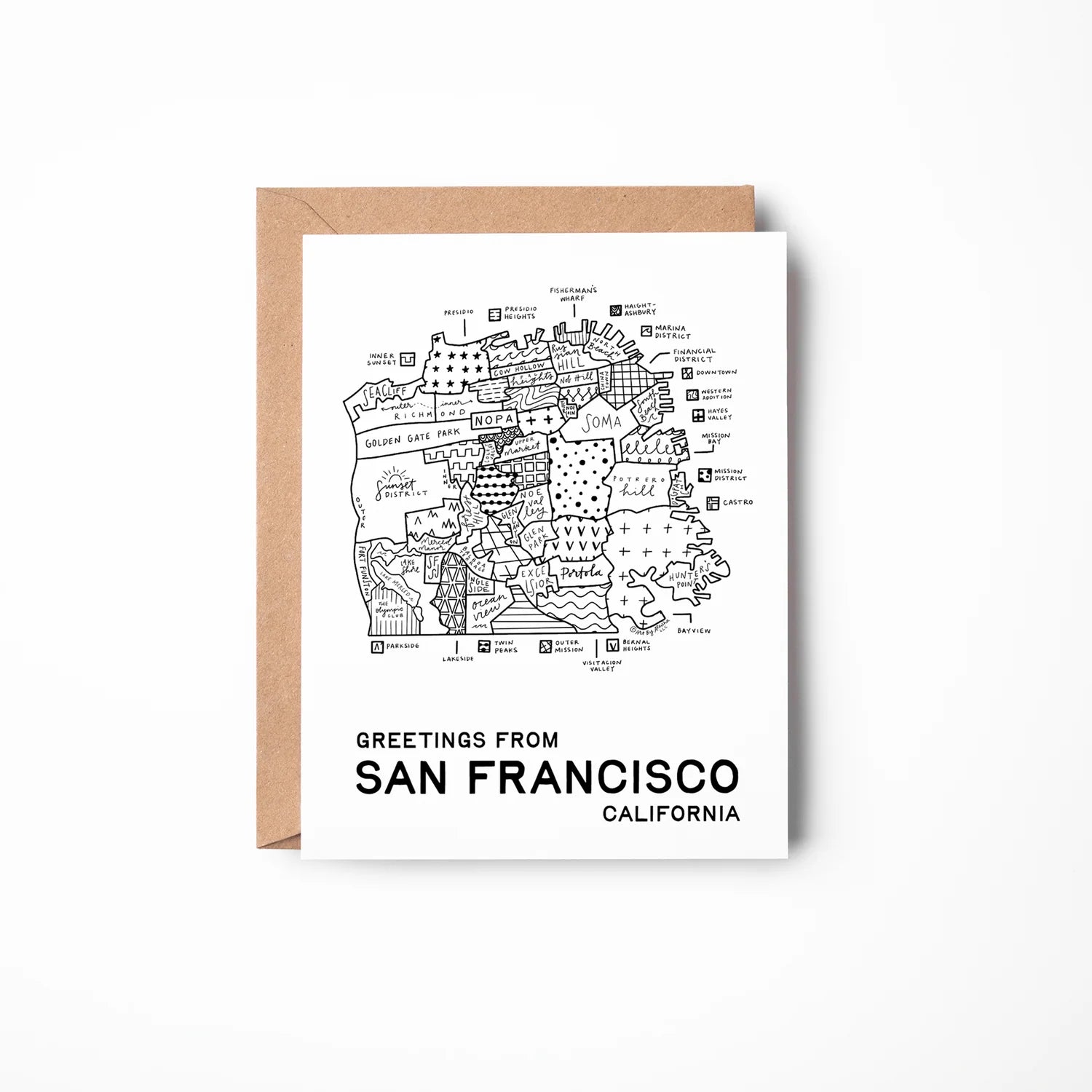4"x5.5" (A2) folded note card featuring the work of artist Aleisha Nelson. The front has Aleisha's signature San Francisco Neighborhood Map illustration, while the inside of the card is left blank. Each card is individually packaged in a clear plastic sleeve with a kraft brown envelope.