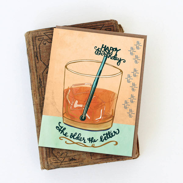 A happy birthday whiskey card. Blank inside. All cards are A2, 4.25 x 5.5. Printed in the U.S. on 100% recycled FSC paper. Envelopes are kraft, 100% recycled. Singles are packaged in a cello sleeve. Illustrations by Cindy LaColla. @cynlastudio on instagram