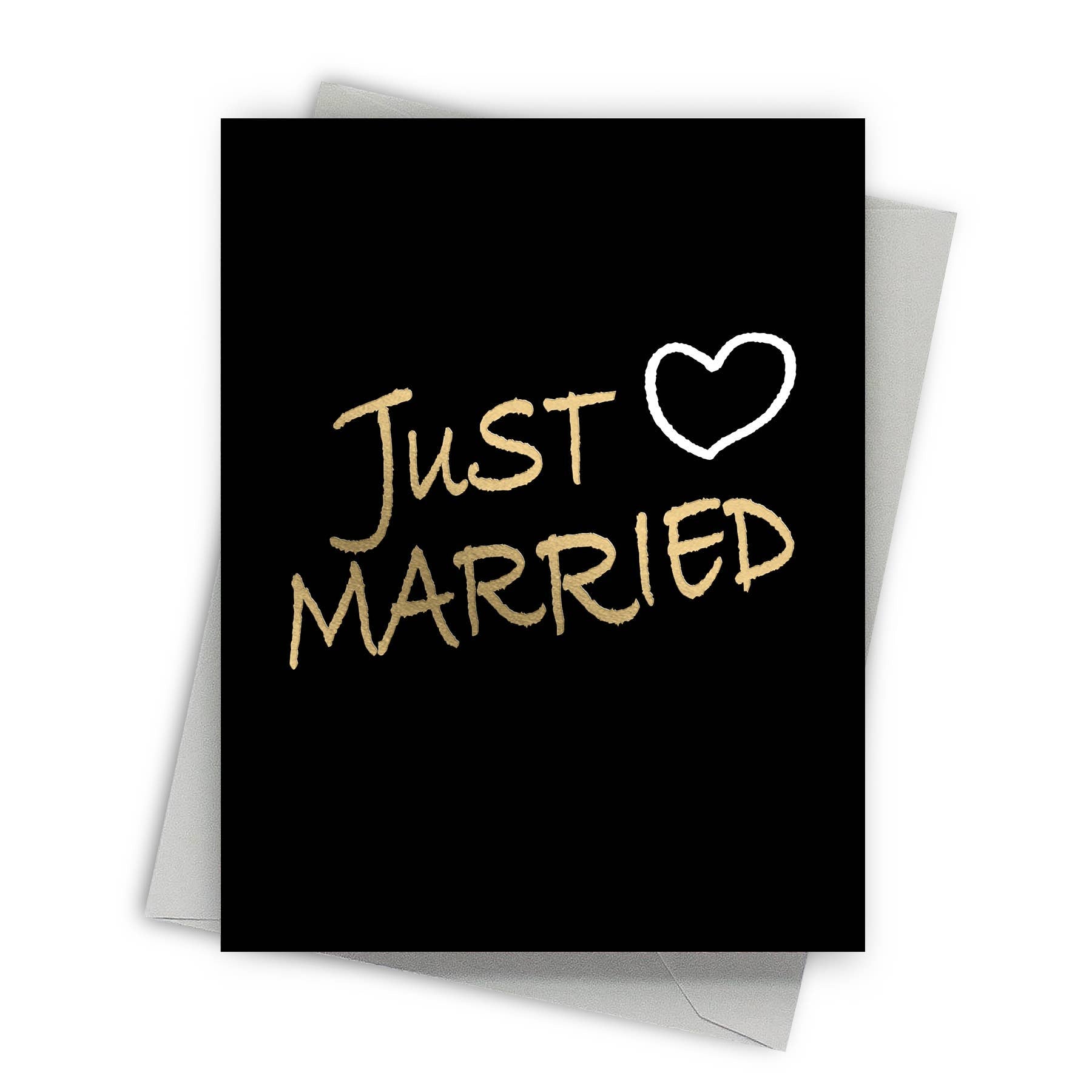 This foil-pressed wedding card is offset printed and features gold foil accents and includes a coordinating gray euro flap envelope.