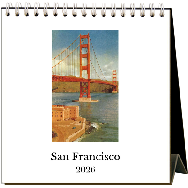 The Golden Gate Bridge, the Ferry Building, Chinatown, Mission Dolores, Civic Center, and the Palace of Fine Arts – this San Francisco easel desk calendar has it all. It features 12 colorful vintage postcard images of Northern California’s premier city, San Francisco, from 1915 to 1960. The calendar measures 6” x 7” x 3” when expanded and is printed on 100% post-consumer recycled, acid-free, natural white, heavy cardstock. Made in the USA!