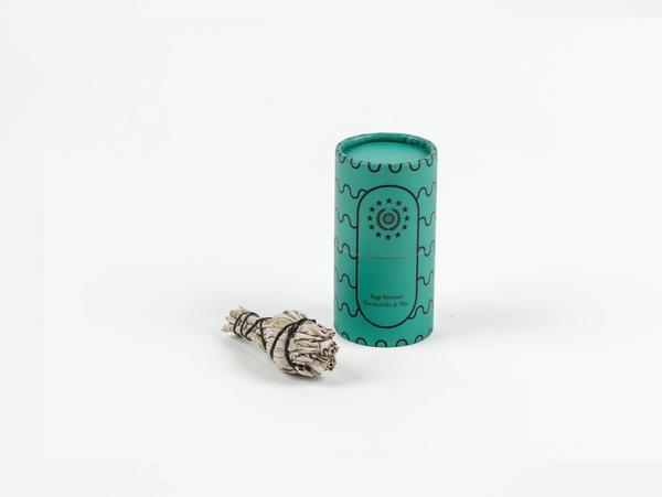 Teal green: sage smudge stick for your health. Applicable to all persons and circumstances in life. 5" x 2.5" x 2.5". Materials: paper tube and incense