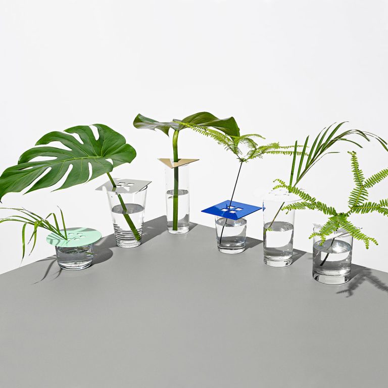 This set of 3 playfully simple shapes instantly transforms everyday vessels into vases. From a single stem to a full bouquet, the shapes and openings are designed to accommodate a variety of flowers and foliage. Steel and cork provides weight and grip, to lift, support, and display stems.