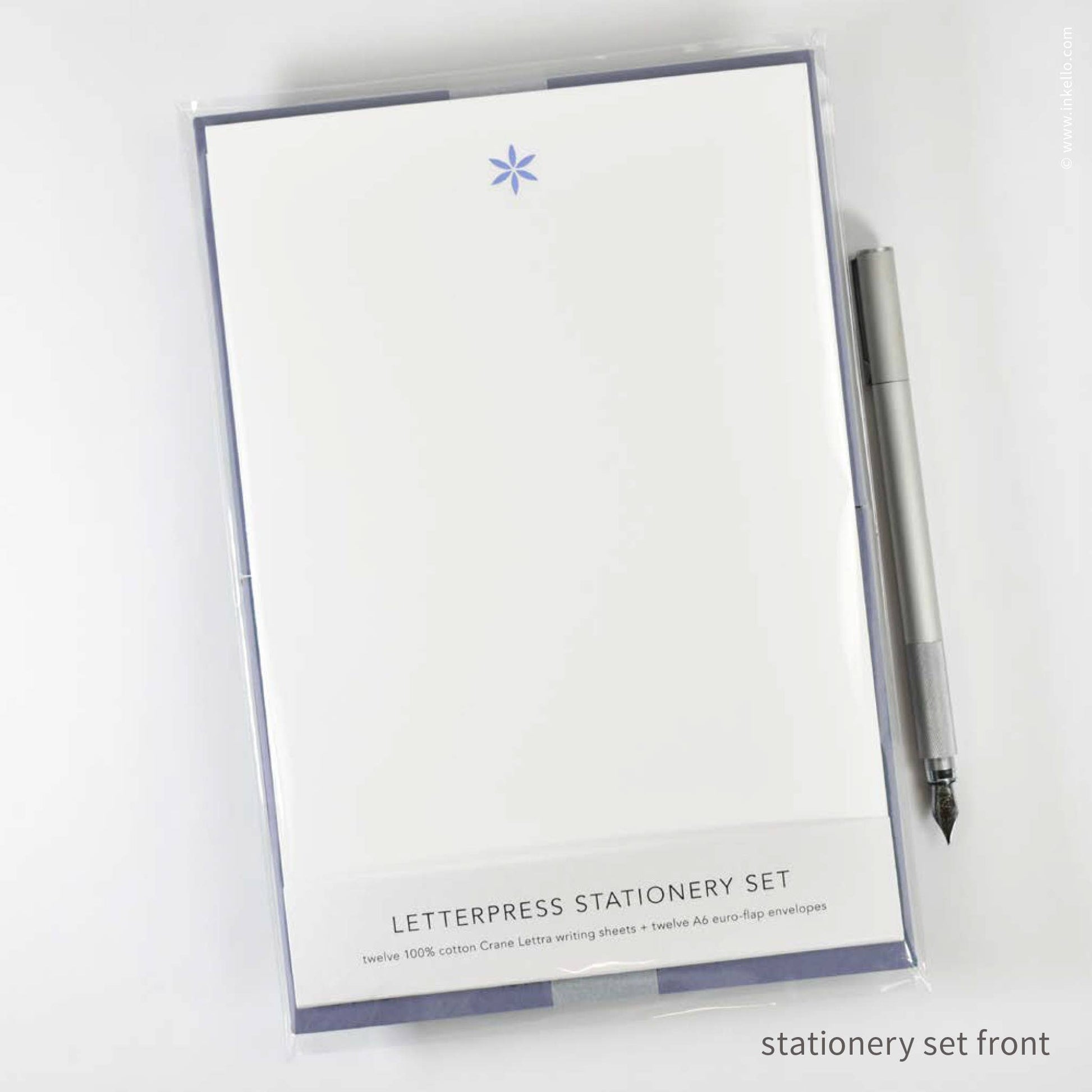 For the love of letter-writing: twelve stationery sheets printed with a simple six-pointed flower in periwinkle letterpress ink. Stationery writing sheets are 100% cotton with luxurious texture. One dozen envelopes in stormy sea blue with a pointed euro flap. Packaged in a cellophane bag.