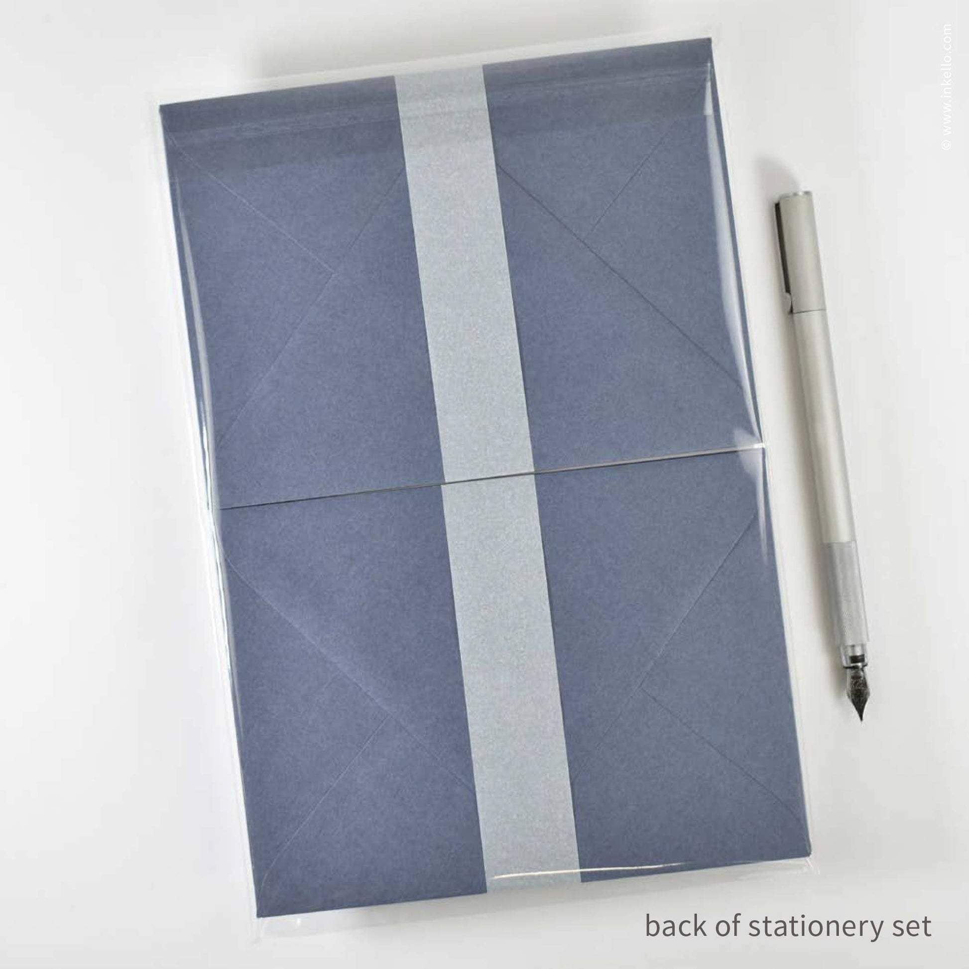 Materials: white 100% cotton text-weight paper for stationery sheets, text-weight envelopes in stormy sea blue, cellophane bag