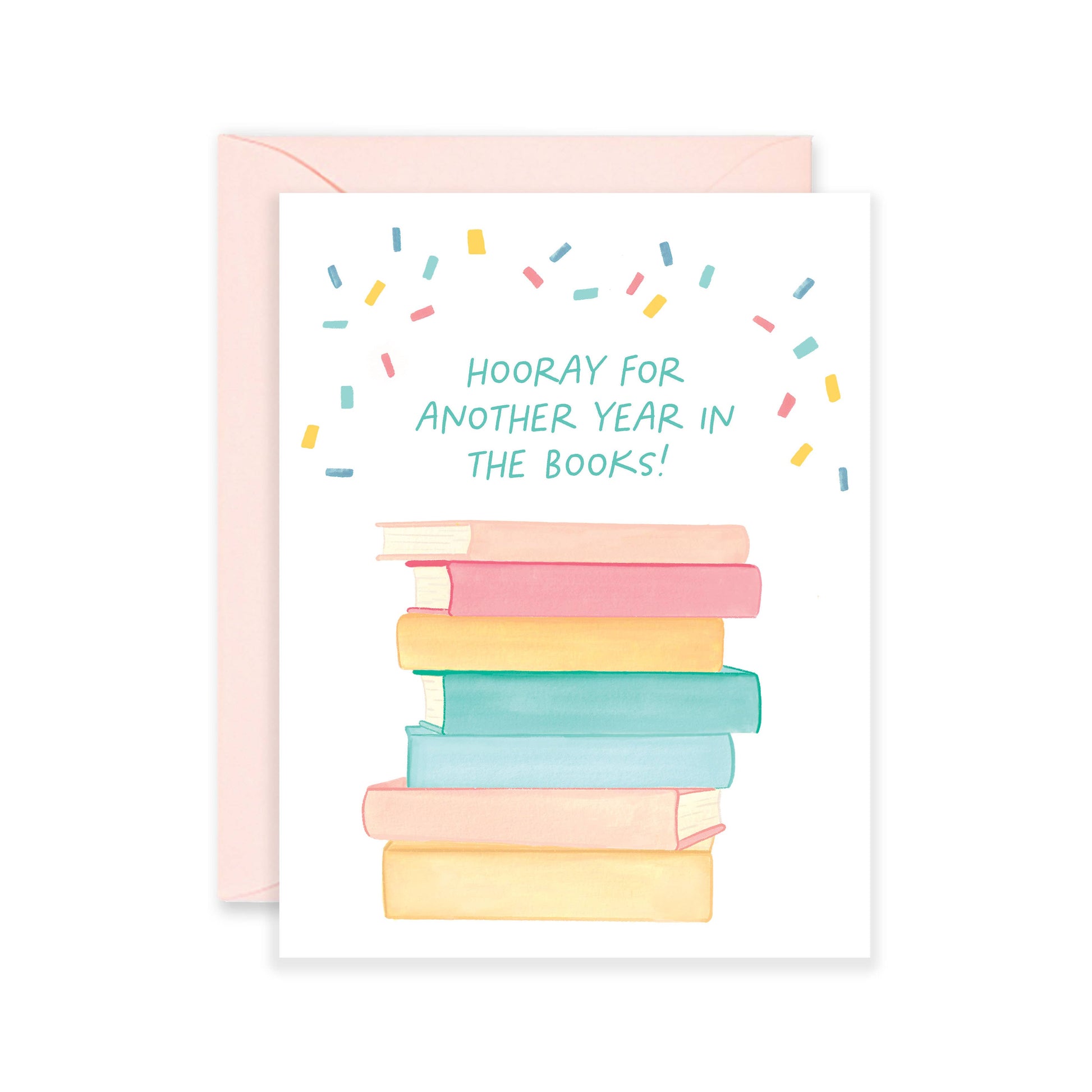 Celebrate your favorite bookworm with this colorful card that reads "HOORAY FOR ANOTHER YEAR IN THE BOOKS!"