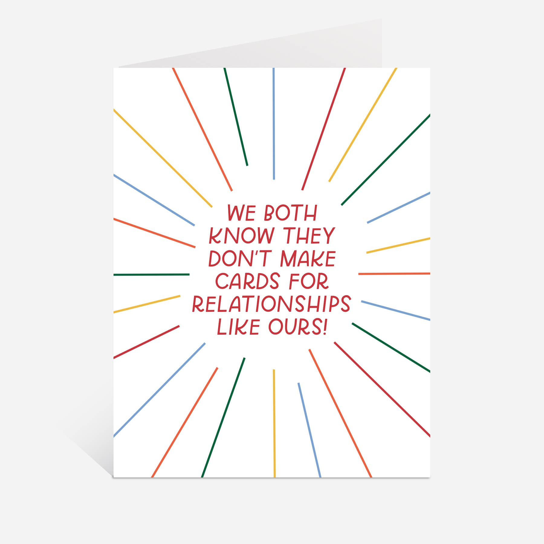 They Don't Make Cards For Relationships Like Ours Greeting Card. Gift this versatile card for several occasions- unique friendship, siblings card, strained relationship, the list goes on! A2 size (4.25” x 5.5”). Folded greeting card, blank inside. Professionally printed on 110 lb smooth card stock. Cello sleeve and envelope included. Hand lettered + designed in Michigan, printed in USA.