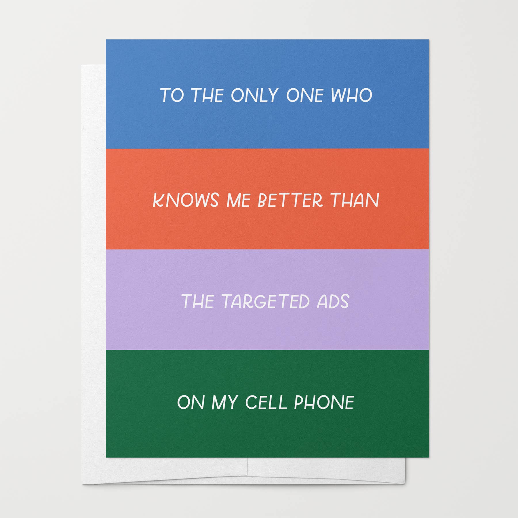 "To The One Who Knows Me Better Than The Targeted Ads On My Cell Phone" funny greeting card. A2 size (4.25” x 5.5”). Folded greeting card, blank inside. Professionally printed on white card stock. Cello sleeve and envelope included. Hand lettered + designed in Michigan, printed in USA.