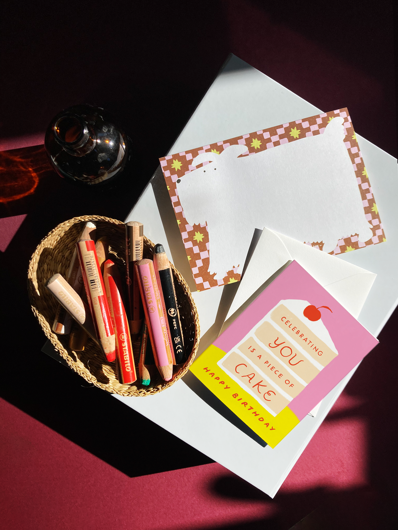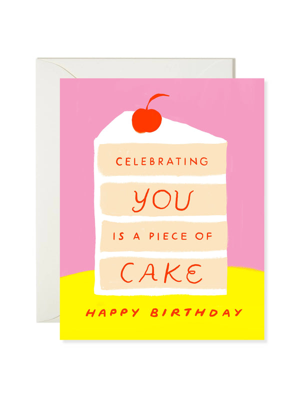“Celebrating you is a piece of cake / HAPPY BIRTHDAY” is the kind of birthday card that does it all—sweet, cheerful, and just the right amount of punny. The artwork features a delicious slice of frosted cake topped with a cherry, set against a bright pink and yellow backdrop that practically throws a party on its own. Whether you’re celebrating a friend who loves dessert or a family member who deserves a fun little treat, this card makes birthdays feel a bit more special. Its hand-lettered message adds a playful, modern touch to the design. Perfect for bakeries, boutiques, or anyone stocking a feel-good birthday section. A2 folded-card, 4.25" W × 5.5" L Printed in full color on FSC® certified white cover paper Blank interior Single greeting card paired with euro-flap envelope Packaged in cello sleeve Printed locally in USA A bright and tasty pick for birthday shelves—it’s like sending cake through the mail (but less messy).