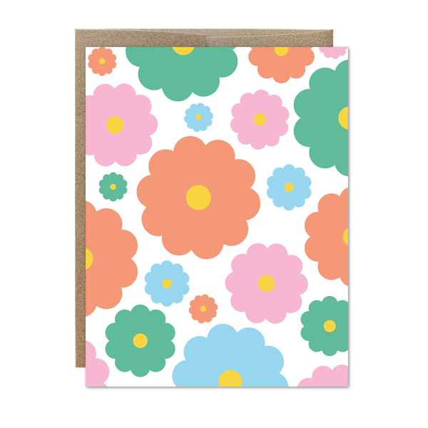 This greeting card features a pattern of simple bright flowers! This card is perfect for any occasion and is sure to bring a smile to anyone's face. The card design showcases a beautiful and colorful pattern of flowers in various shades of pink, yellow, and blue set against a white background.