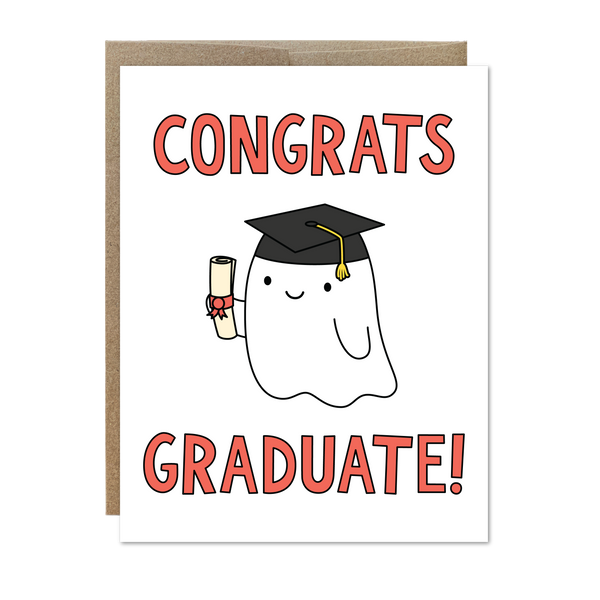 Celebrate their big achievement with this adorable "Congrats, Graduate" card! Featuring our signature ghost character proudly wearing a graduation cap and holding a diploma, this card adds a playful and charming touch to any graduation celebration. Printed on high-quality cardstock, it’s the perfect way to congratulate the grad and send them off on their next adventure!