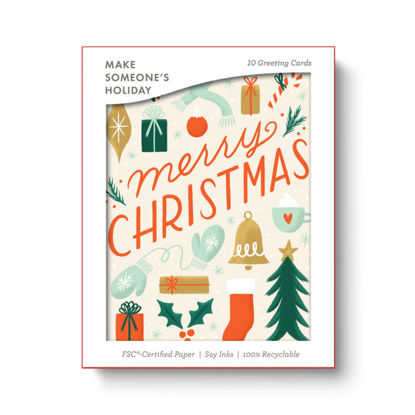 Stockings hung by the chimney, warm cups of cocoa, the magic of the mistletoe—these cards feature artwork that celebrates the little things that bring big joy to the winter season.