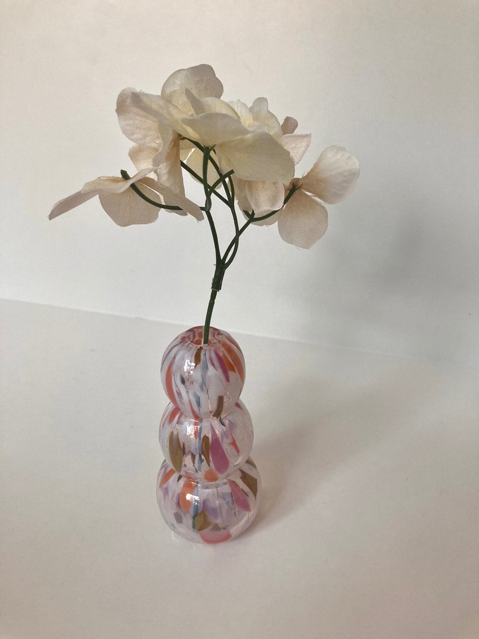 This vase is a colourful creation with colours of milky white, raspberry, flamingo, and mocha.