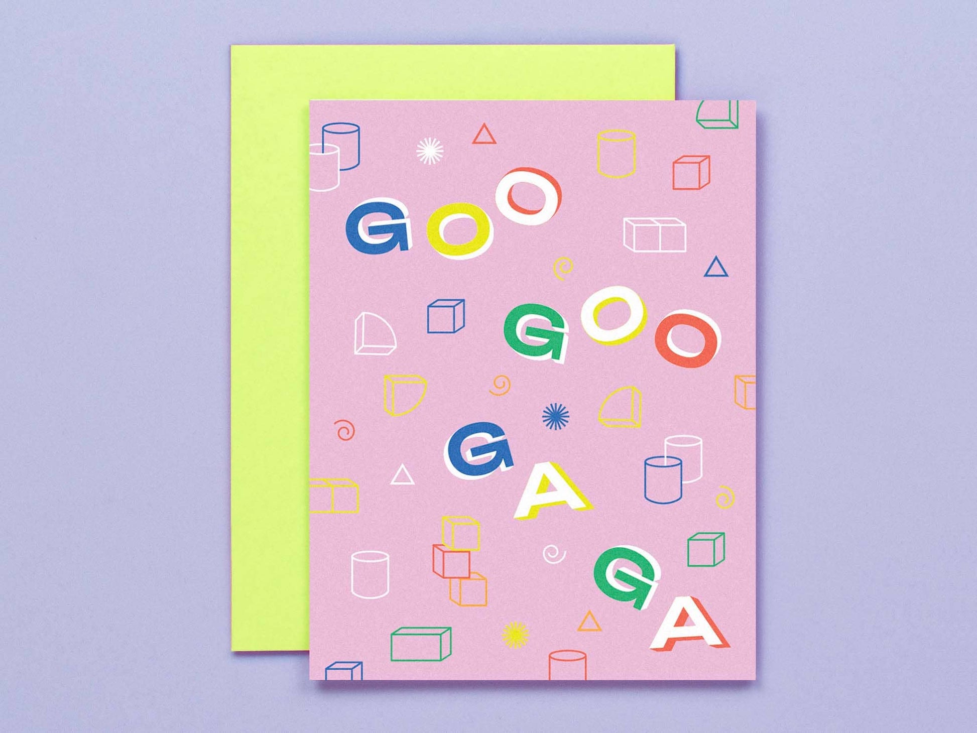"Goo Goo Ga Ga" playful typographic baby card with abstract blocks and shapes.