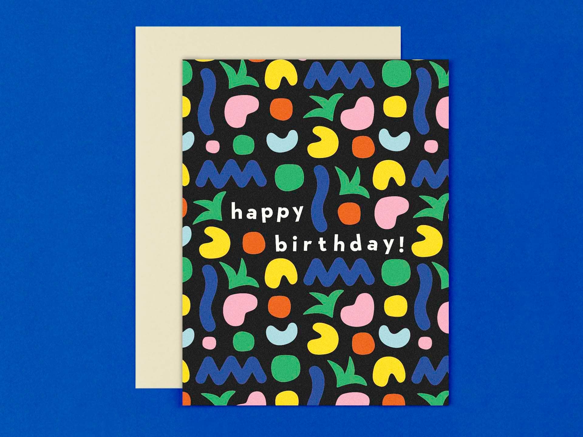 Birthday card with colorful, abstract, blobby shape pattern and a hint of tropical paradise.