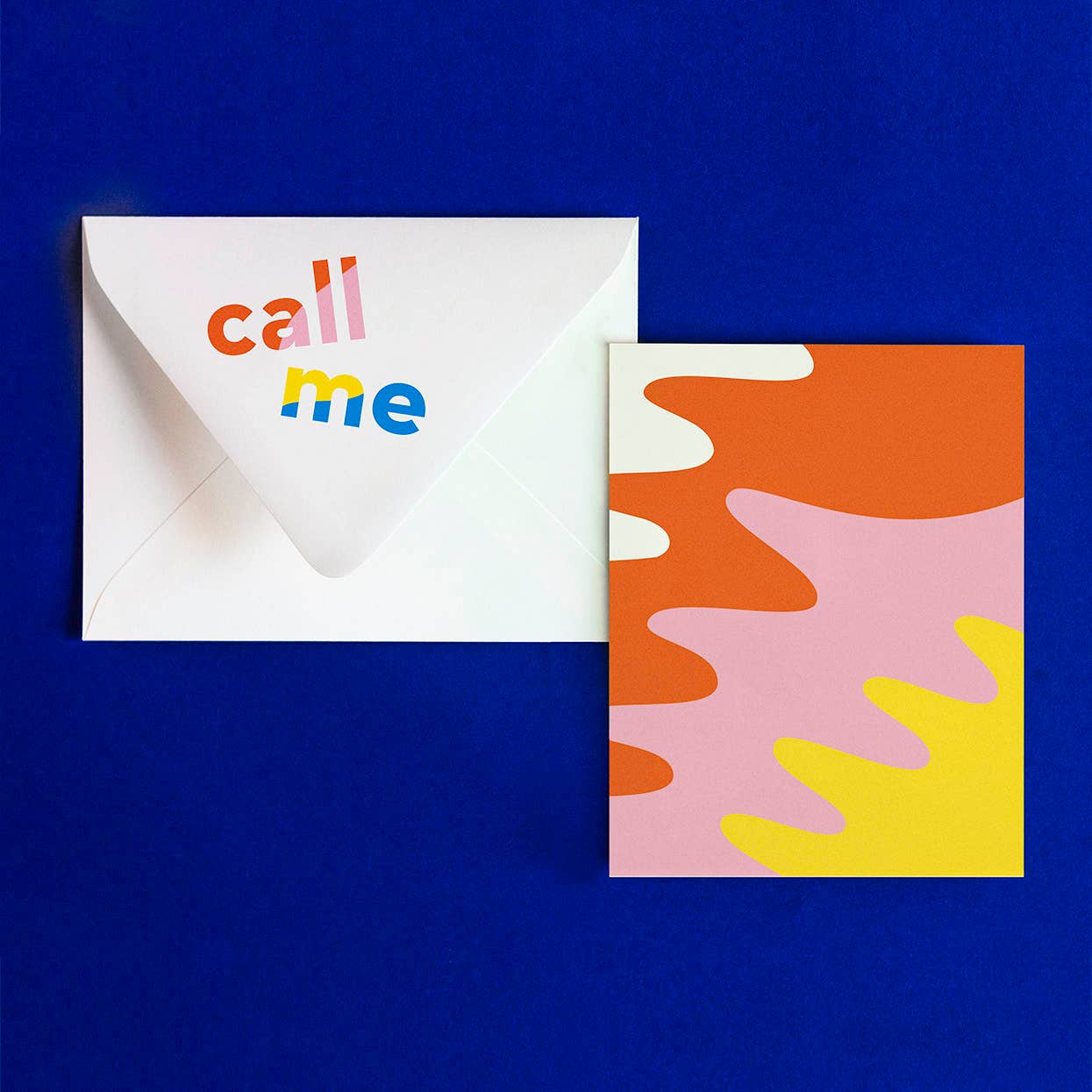 Blank folded greeting card with all-over graphic pattern. Comes with a printed envelope that reads "call me" in colorful, pattern-filled typography.