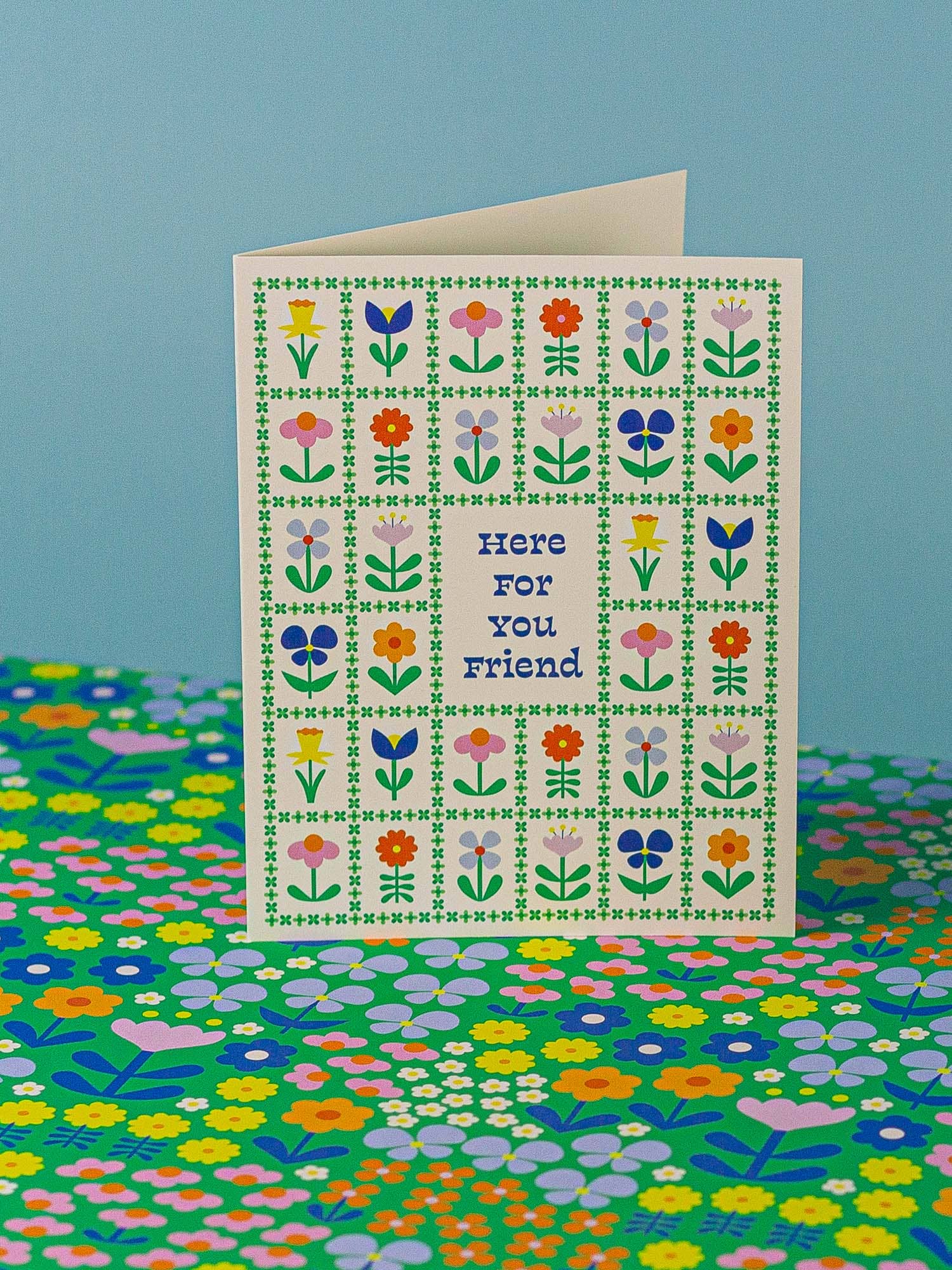 Flower Friends Forever. Cheerful retro floral encouragement or sympathy card. A Card with cute, graphic, minimal, floral illustrations. Made in USA by @mydarlin_bk. • Greeting Card • Blank inside • A2 (4.25" x 5.5") • 100# FSC-certified paper • Comes with a color-coordinated envelope • Packaged in a protective cellophane sleeve • Flat-printed • Printed in the USA
