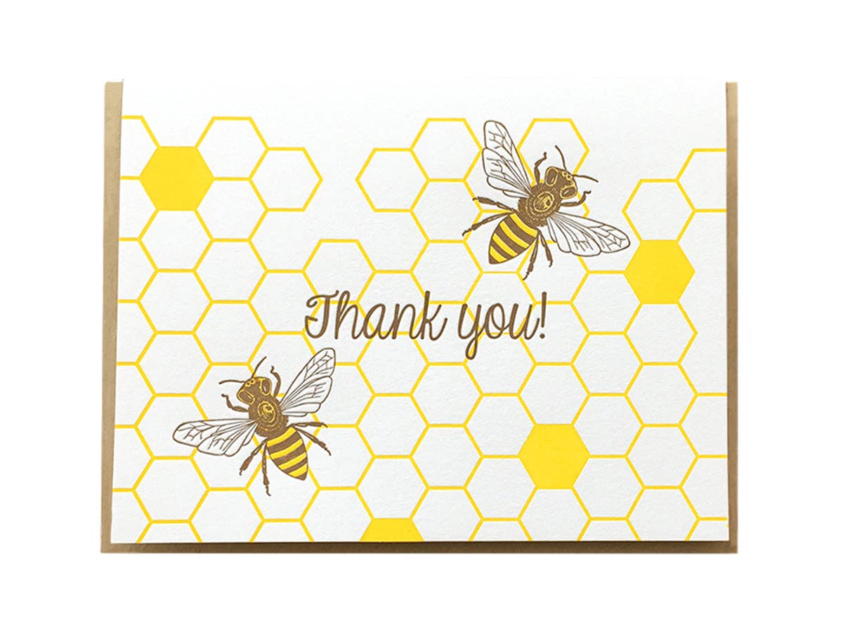 Image Description: a white folded A2 letterpress card, a yellow honeycomb pattern covers the card, the brown text "thank you!" centered with two honey bees flying around the text