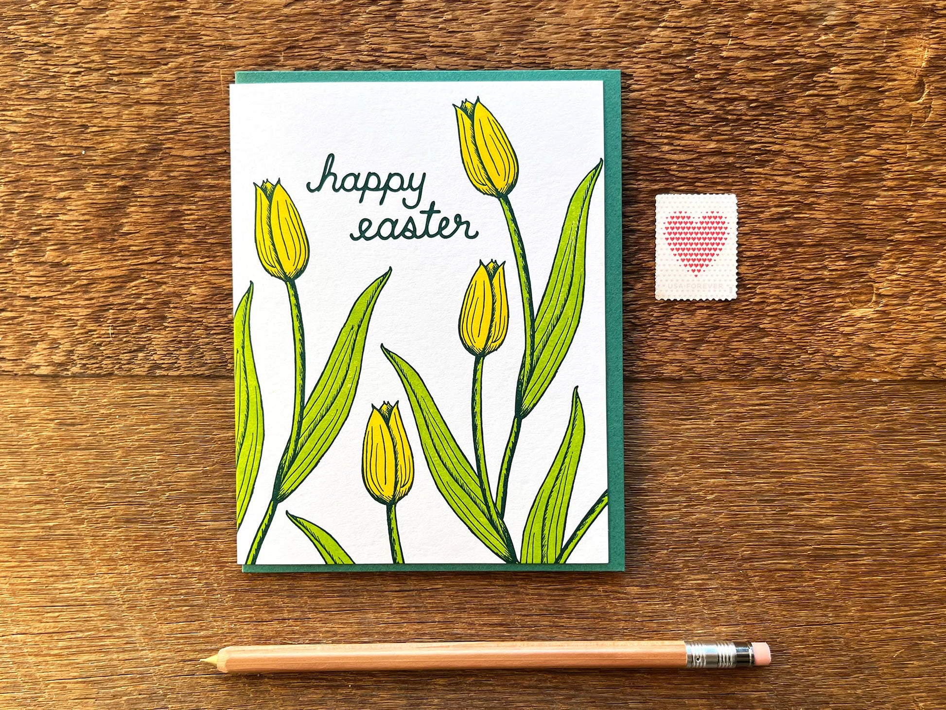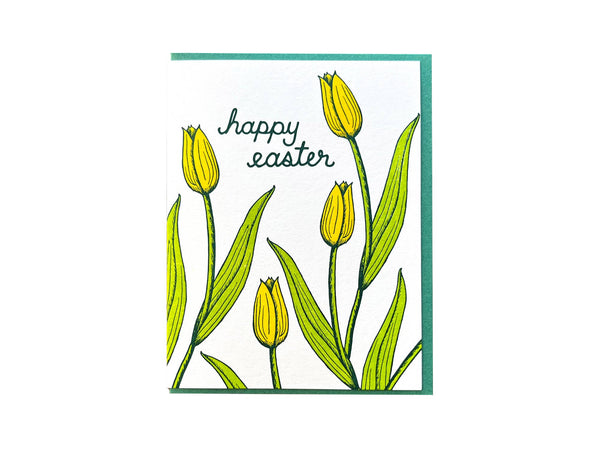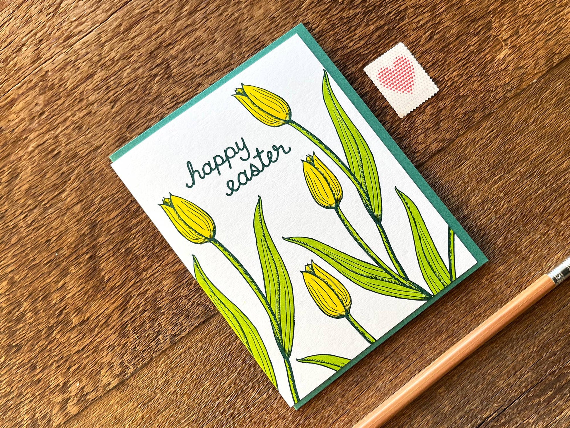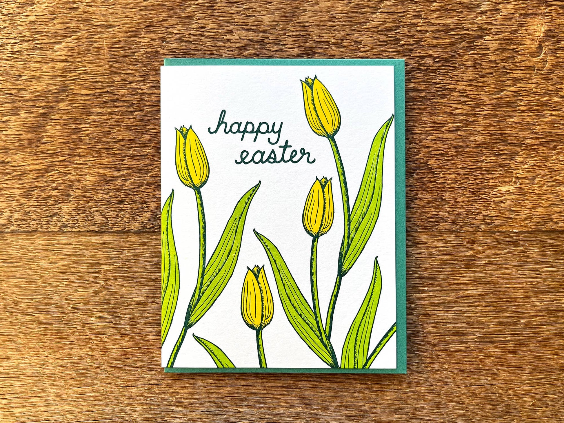 Image Description: a white folded A2 letterpress card with four yellow tulips with light green stems and leaves, the text "happy easter" in the top left
