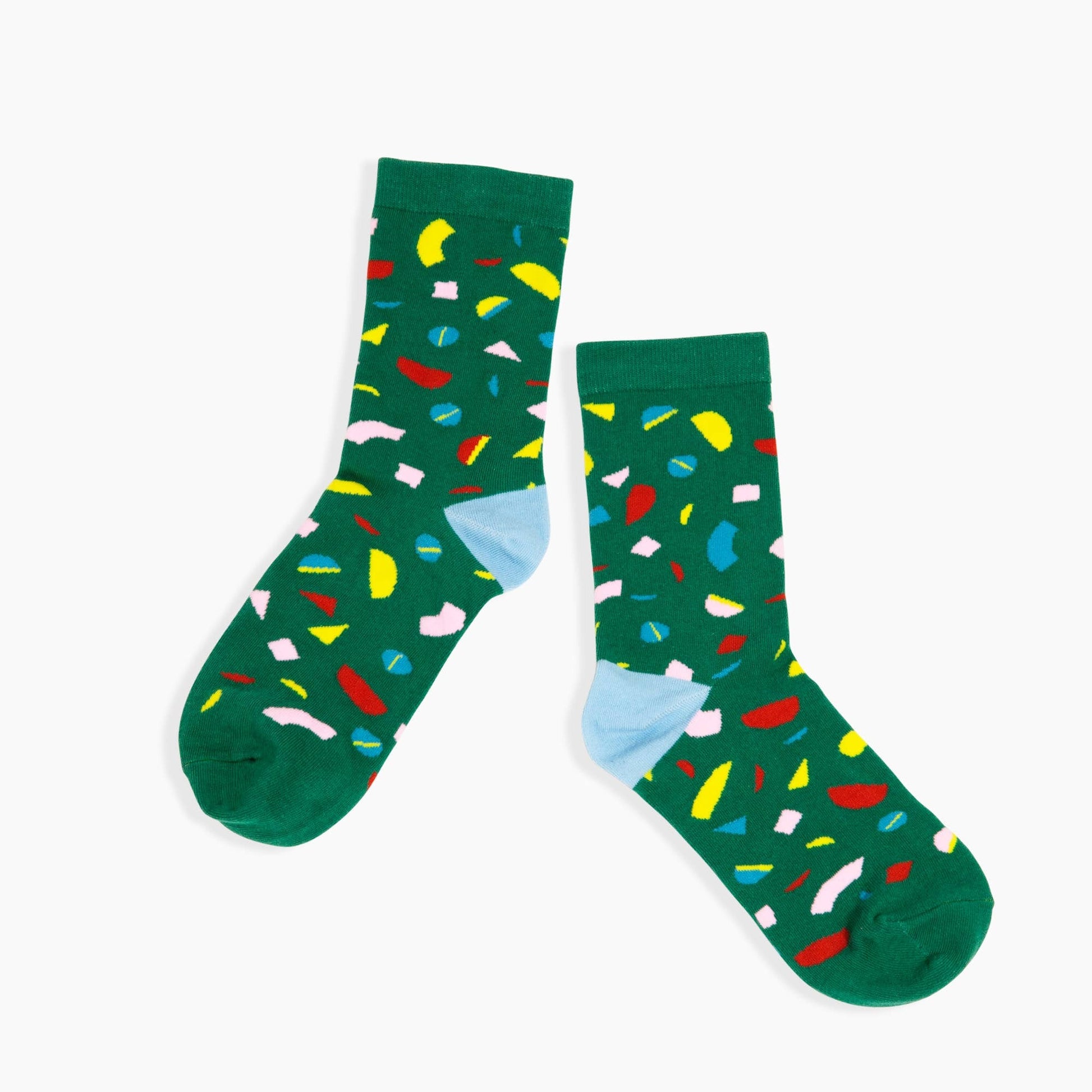 New and improved, these new socks are stretchier and softer than our original versions. They are creative, cool, and comfortable Cotton socks with green background with small multi-color shapes