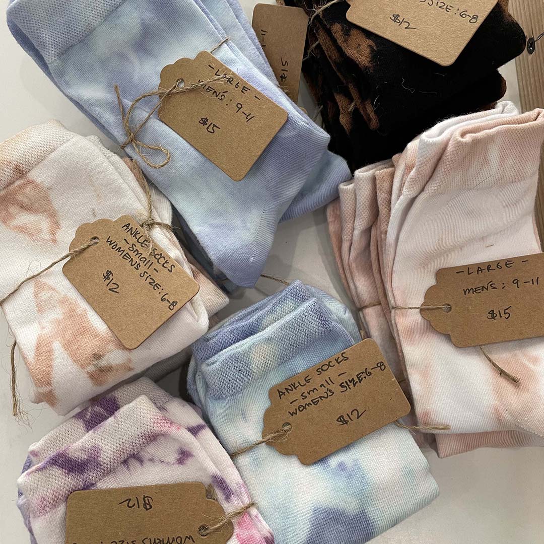 Hand-dyed and pre-washed socks. Made in San Francisco. Each one is unique and each design shipped will vary .One size fits most. (roughly Women's sizes 6-8). Unisex! 73% cotton, 19% poly, 5% nylon, 3% elastane.
