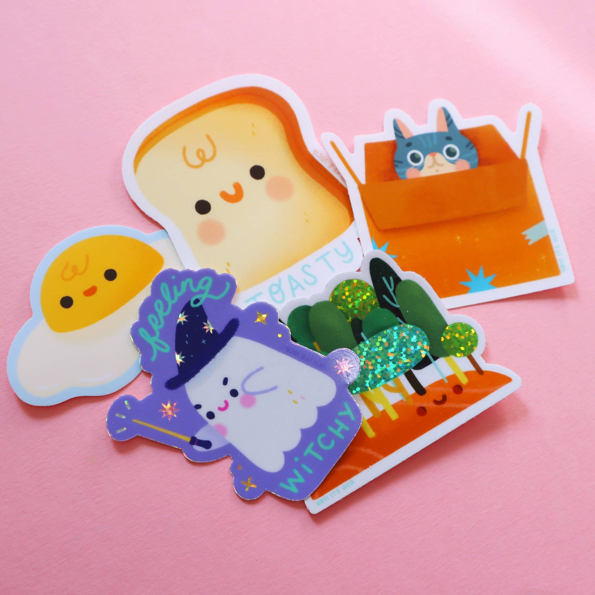 Have an egg-cellent day with this cute sticker! :) Place this durable waterproof sticker on your laptop, sketchbook, journal, water bottle, or anywhere else that might help brighten your day. This is an original illustration by Vica Lew, printed on premium matte vinyl sticker paper, and is approximately 3 x 2 inches.