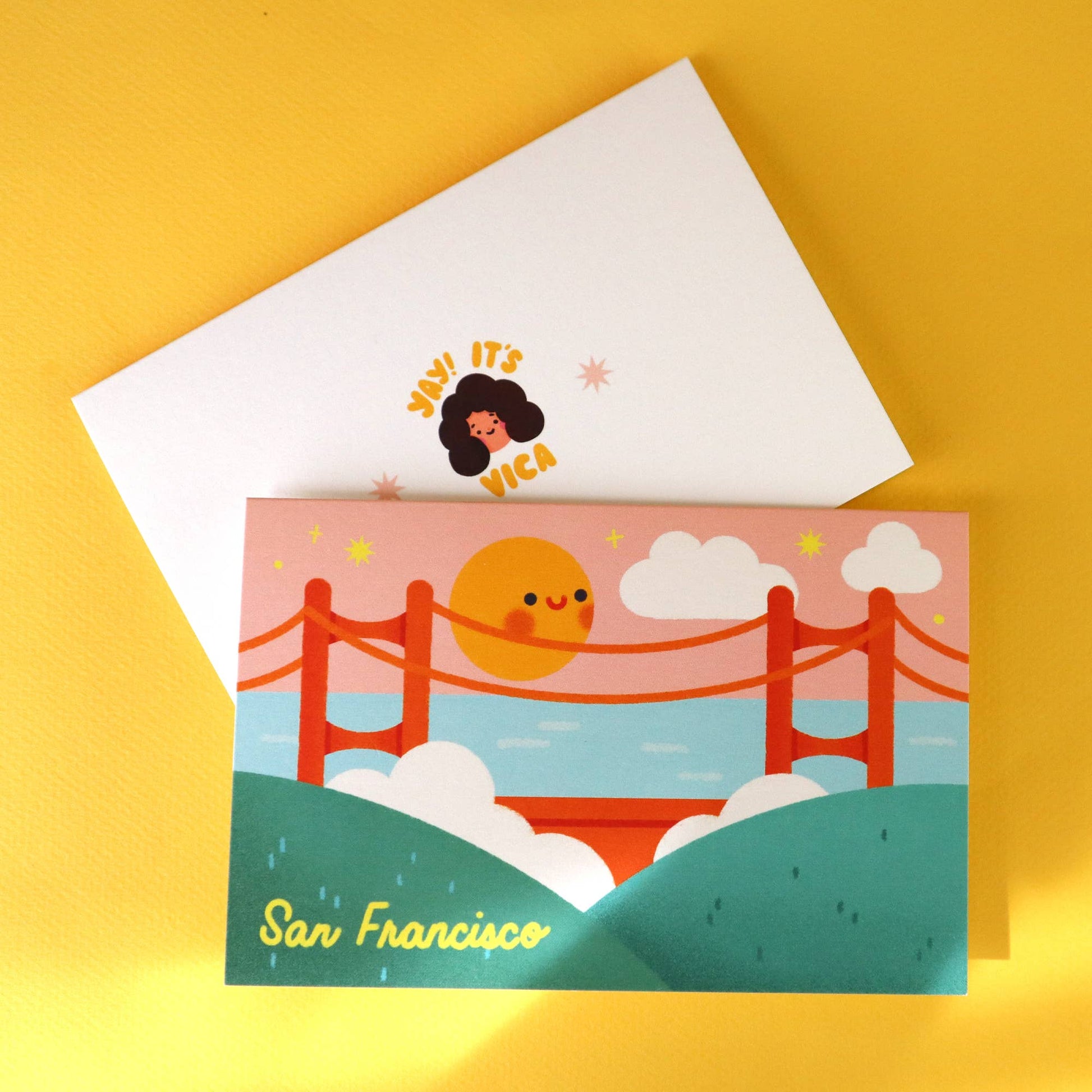 Send a greeting card to someone from lovely San Francisco, with a cute illustration of the Golden Gate Bridge. This card is 4 x 6 inches and is printed on matte paper. Each card features an original illustration by Vica Lew, and comes with a white envelope.